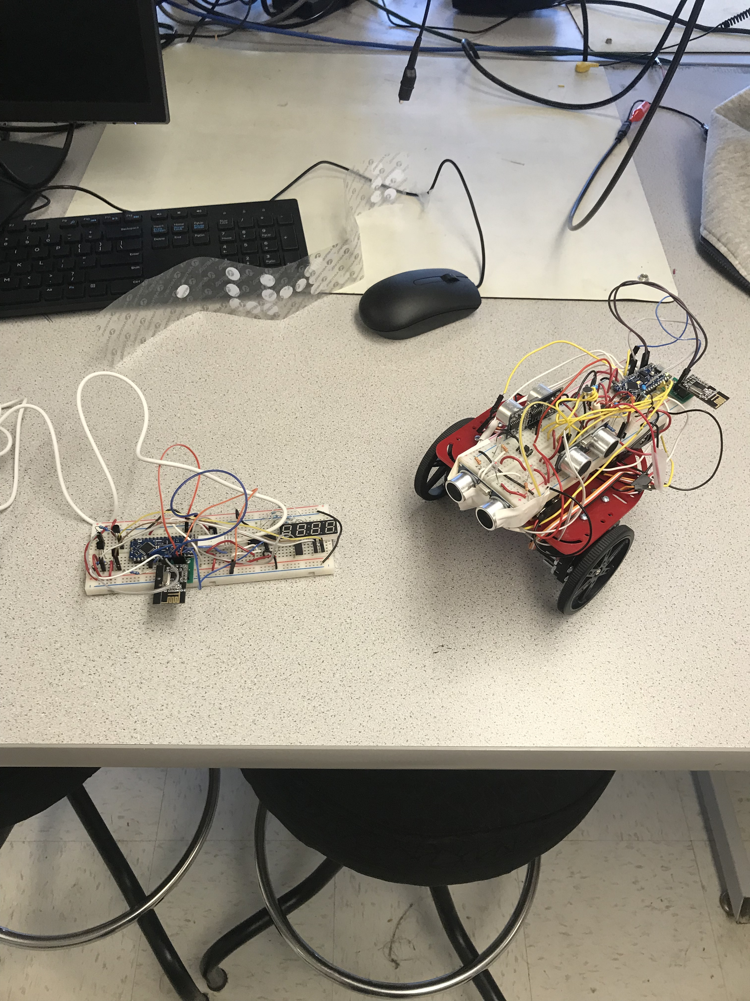 The newest component of our robot is the RF transceivers we used in this lab. These were easy to assemble and attach as they only used a few pins. We adapted code to use our specific send channel and tested the transceivers with dummy variables. These numbers would eventually have to be combined with the display code for the base station we built earlier in the course. We also figured out how much power we needed to use to ensure that the radio information package would be received by the base station and displayed at a certain distance. This concluded the additions we had to make to the robot to be ready for the final demo.